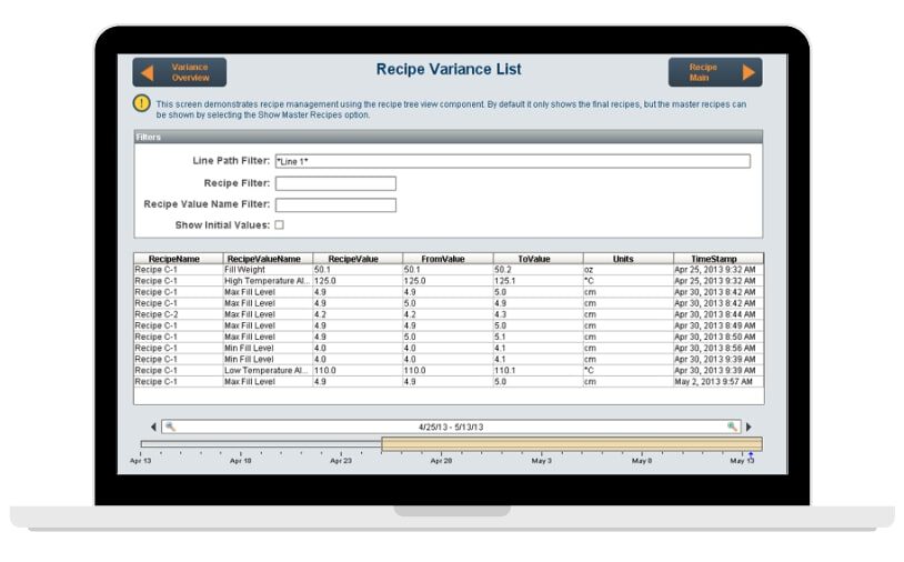 Bewaak machine-instellingen en identificeer afwijkingen in realtime om kwaliteit, stilstand of andere productieproblemen te voorkomen. Machine-instellingen die buiten het receptenbeheersysteem op een operatorinterface terminal worden gewijzigd, worden gedetailleerd in het variantie logboek opgenomen.