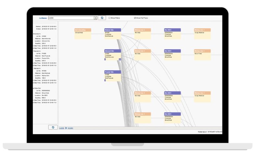 Met de Track & Trace module kan je productinformatie zoeken via een uniek en gemakkelijk te navigeren Trace Graph-display. De trace-grafiek geeft jouw zoekresultaten weer in een visueel formaat met links de grondstoffen, in het midden de fabricageprocedures en rechts de afgewerkte producten. Met de trace-grafiek kan je alle processen, runs, partijen en routes zien die elk product heeft doorlopen. Al deze informatie is chronologisch geordend en op één plaats weergegeven, zodat je eenvoudig de exacte informatie kan vinden die je nodig hebt.